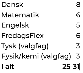 På Rønde Privatskole har vi fokus på fagene dansk, engelsk og matematik. Derudover vil der kunne vælges fagene fysik/kemi og tysk. Disse fag køres i løbet af mandag til torsdag. Det betyder at du kan vælge om din skoleuge skal indeholde 25, 29 eller 33 lektioner. Vi tror på, at du kan tage ansvar for din læring og sammensætte de fag, der vil klæde dig bedst på til ungdomsuddannelse.